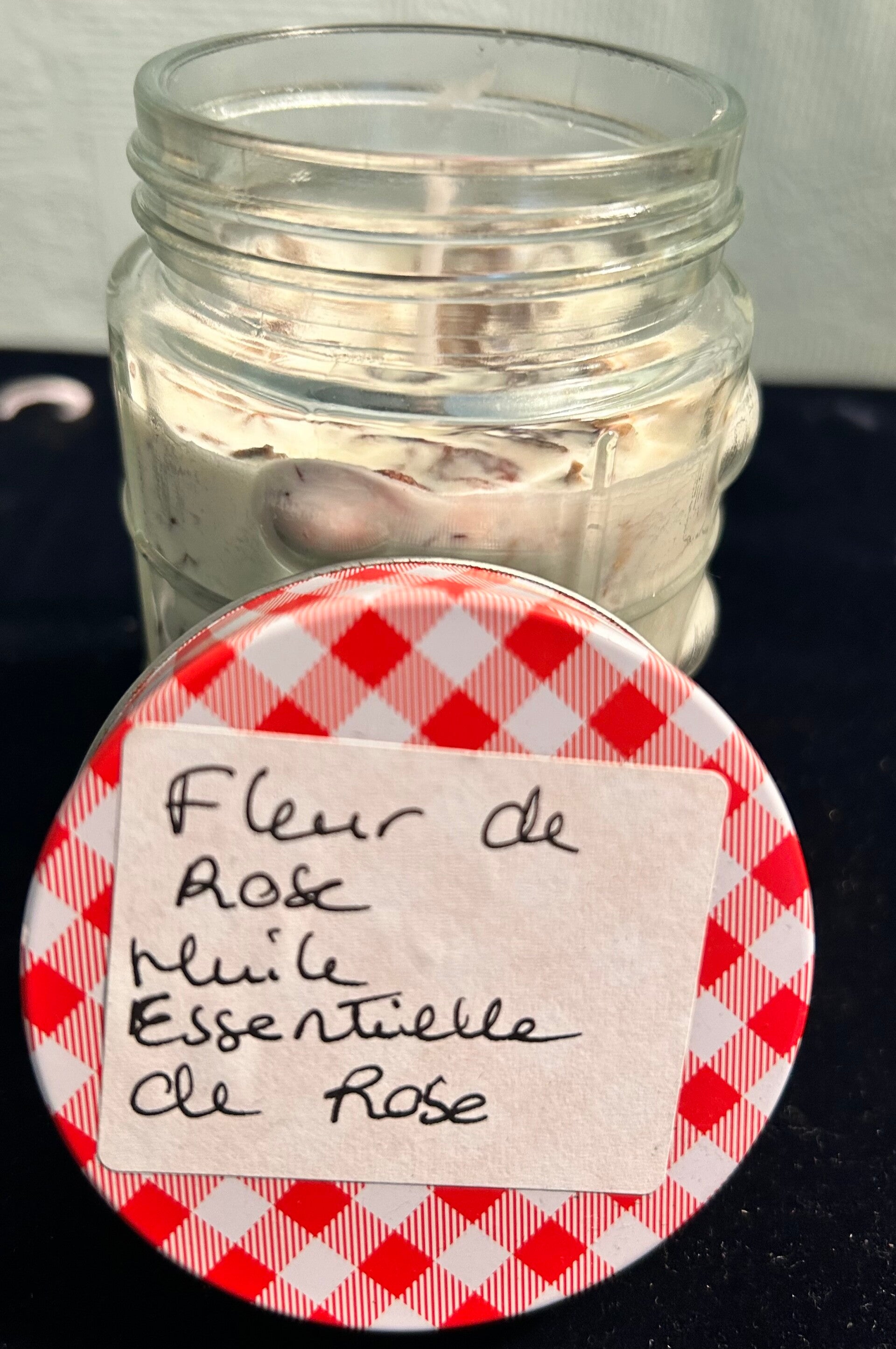 Ele contient cire de soja, fleurs de rose, huile essentielle de rose